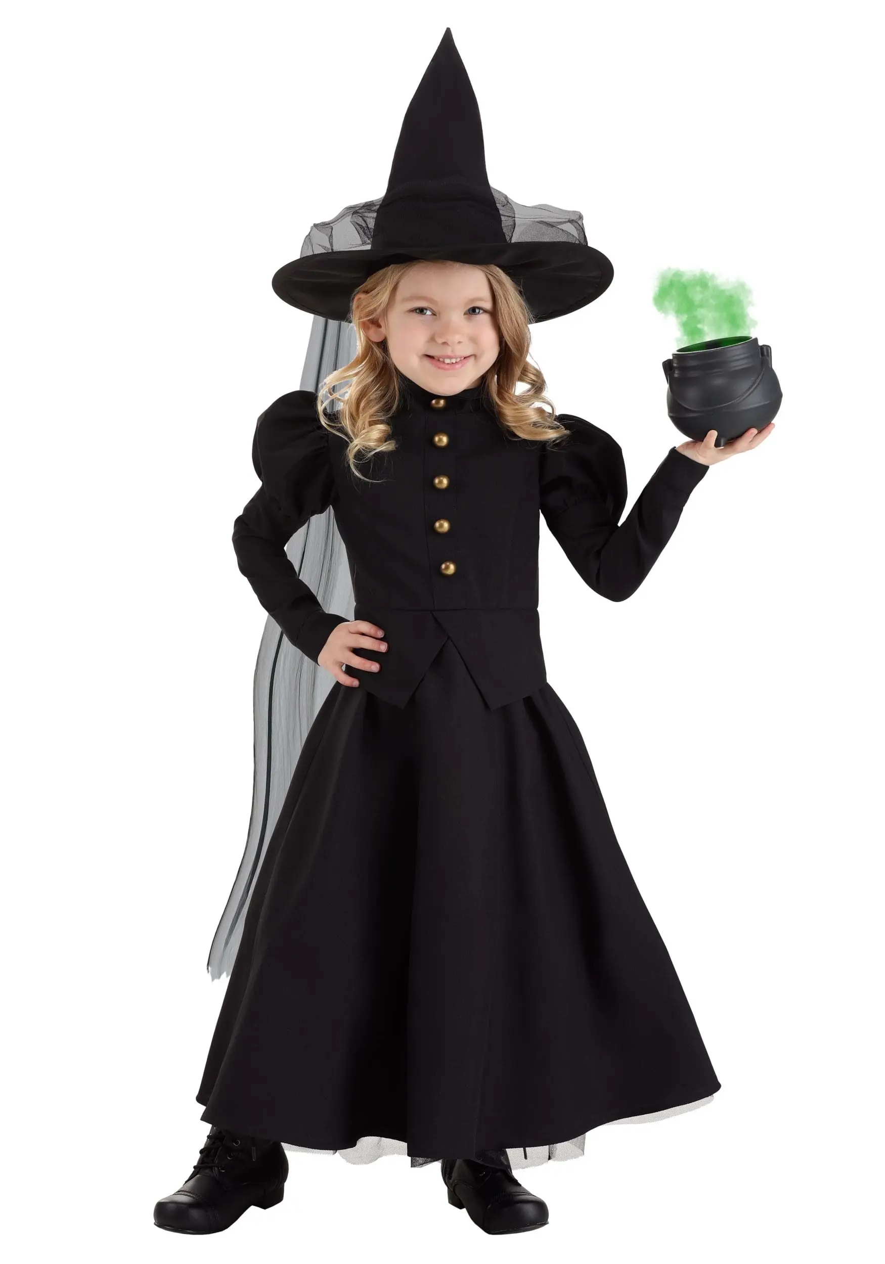Your toddler will look devilishly sweet in this Girl’s Deluxe Classic Witch Costume for Toddlers! The exclusive outfit includes a long black poplin dress that zips up the back and is styled to look like a jacket over a skirt. The princess-cut bodice has a high collar and gold-tone buttons marching down the middle. The leg o’ mutton sleeves are adorably old-fashioned and pair well with the sweeping skirt. An included black petticoat is sewn with layers of tulle to give the skirt extra body. Add the tall, pointy witch hat with its mesh sash!Â