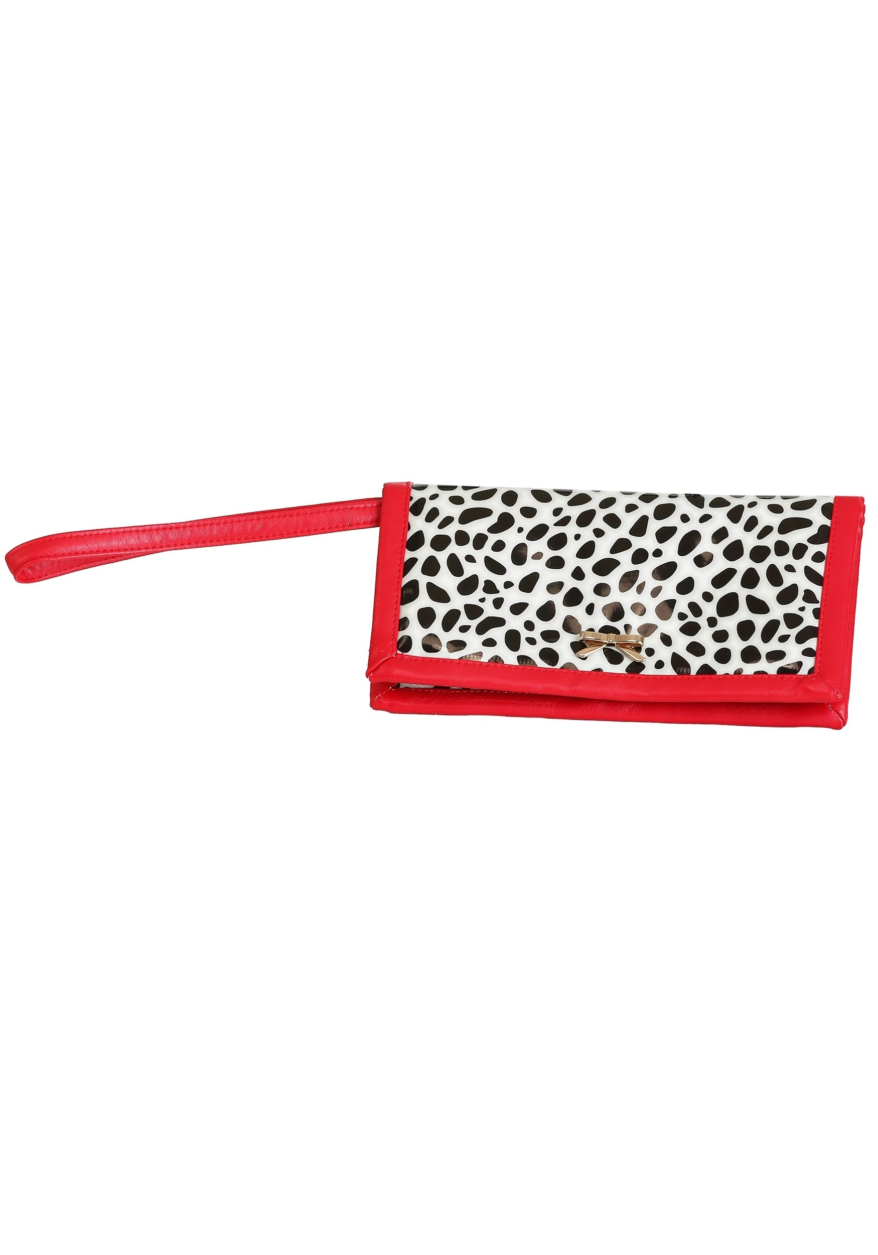 This Dalmatian patterned wallet can be slipped around your wrist to be used as a clutch. It fastens with a hook and loop fastener so your goods are secure. There’s a slot for your phone, a clear slot for your money, and layered slots for credit cards and your id. A gold bow and red trim make this into a fabulous and quite villainous accessory.