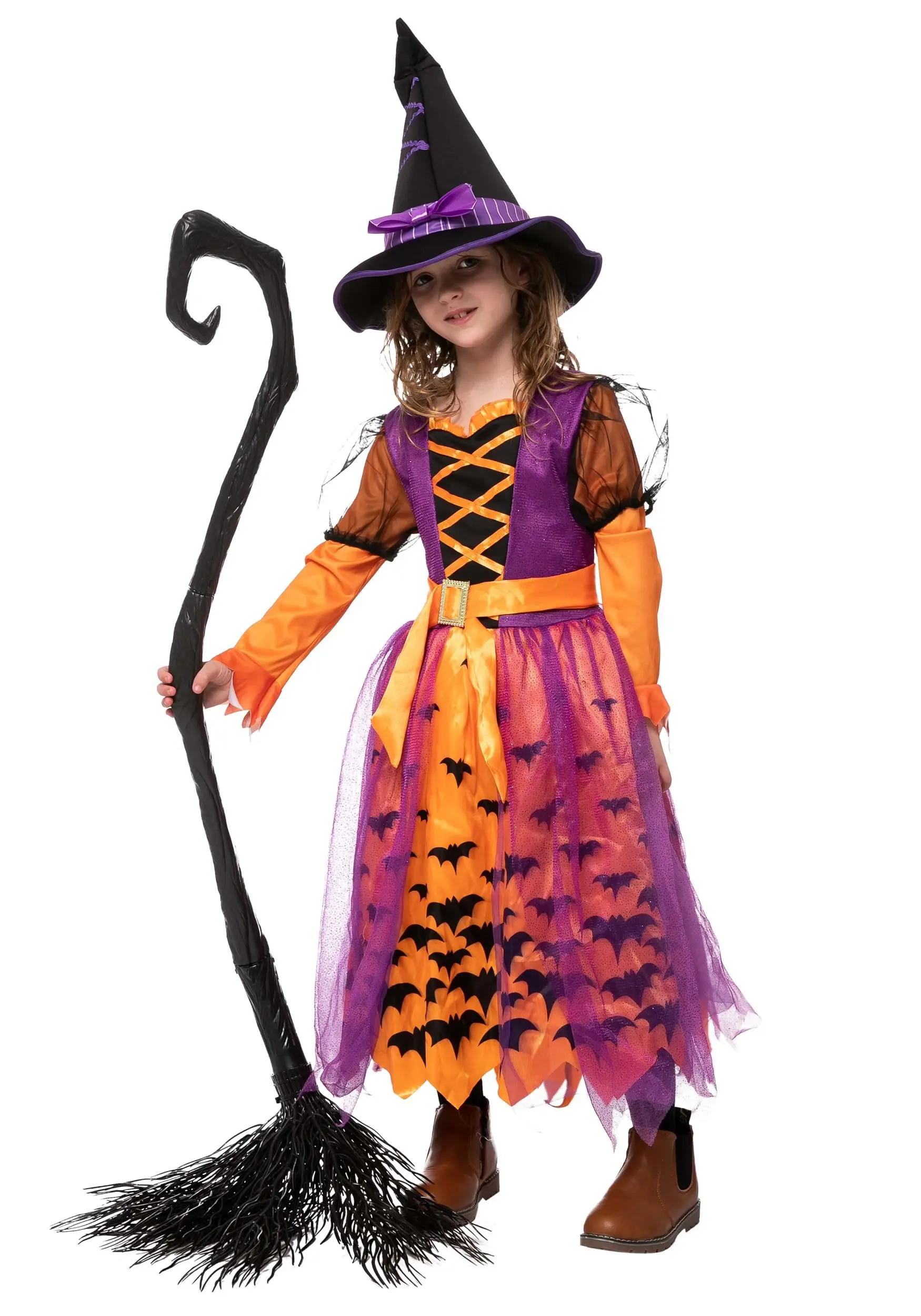 Show your Halloween spirit in a Light Up Orange Bat Toddler/Girl’s Witch Costume! The long dress is a spunky and seasonal mix of purple, black, and oragne colors. The bodice features a ruffled neckline and criss-cross ribbon details, while the long sleeves have zig-zag cuffs and black mesh shoulder puffs. A thick orange ribbon with a plastic buckle fastens around your waist. The orange underskirt is printed with bats and is decorated with an open-front purple mesh overskirt. The classic pointed black hat has purple ribbon details.Â