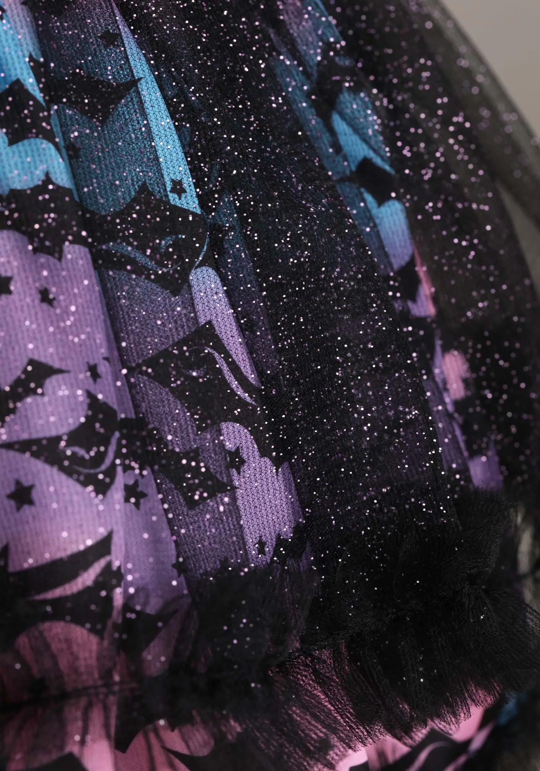 - Skirt has bat-print satin base layer w/ glittery mesh overlay